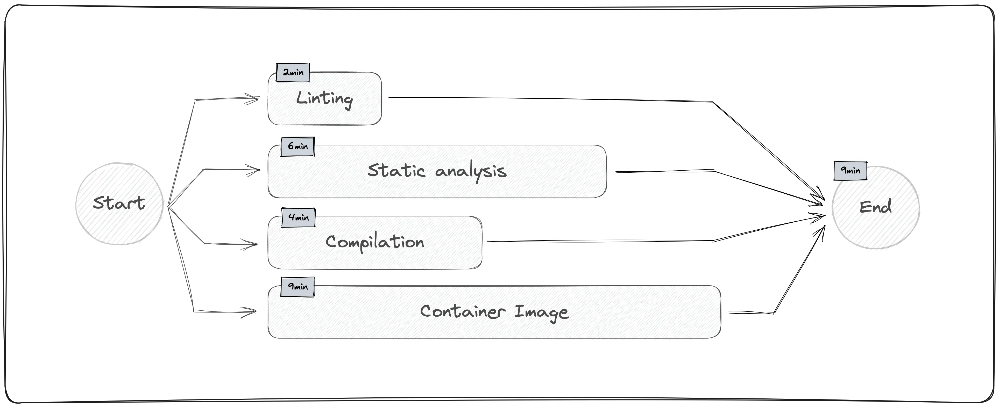 You can make a trade-off here to parallelise things that generate artefacts, by trading storage space for speed. Yes, if the build fails, the artefacts aren’t useful but if you can spare the storage space, and handle cleanup/archival on a fixed schedule elsewhere, you can save time by not requiring code correctness before you start building the artefacts. If the docker image build takes 5 minutes, and the full static analysis suite also takes 5 minutes, waiting for the analysis feedback before building the docker image costs you time.